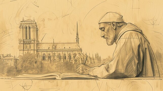 Biblical Illustration of St. Anselm of Canterbury Writing in 12th-Century English Cathedral, Beige Background, Copyspace