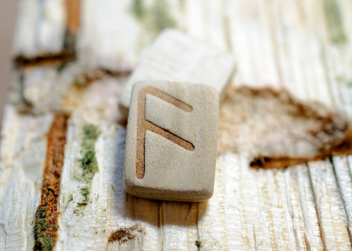 Wooden rune Ansuz close-up on a wooden background. Soft focus