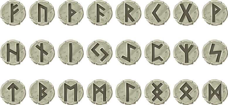 Viking runes, celtic alphabet with ancient runic signs on stone, scandinavian letters. Abc nordic font. Elements for computer games or ui graphic design. Cartoon isolated vector illustration.