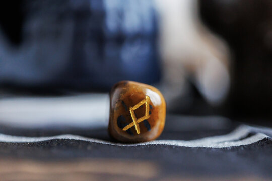 Ansuz Nordic stone rune on animal fur. Letter Aesc of the Viking alphabet.