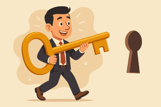 Businessman carrying golden key to unlock a keyhole. Concept of success, opportunity, and business growth. Finding the right solution and strategy. Cartoon vector illustration.
