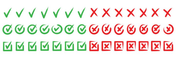 Grunge crayons drawn tick and cross symbols set. Chalk stroke green and red handwriting checkbox wrong right choice marks with rough texture vector graphic