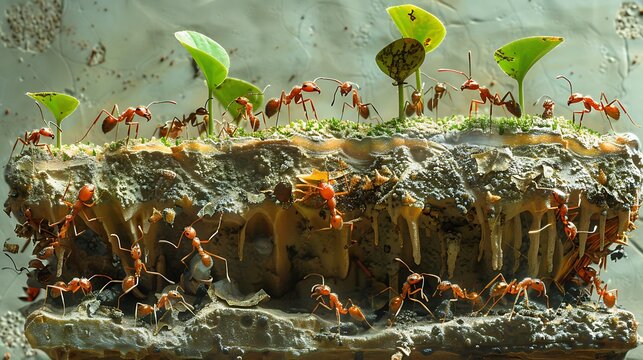 Leafcutter ant colony building fungus garden, cross-section view: A cross-section view reveals a leafcutter ant colony busily building a fungus garden, with ants carrying leaf fragments to nourish