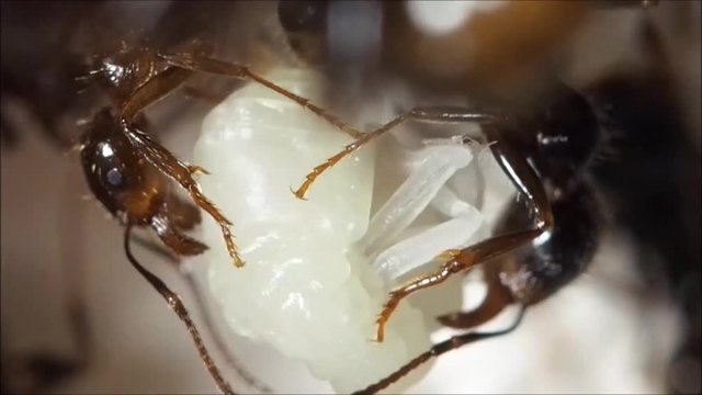Pupation ant larvae. Two ant larva kept. The larva transforms into a pupa. macro Express