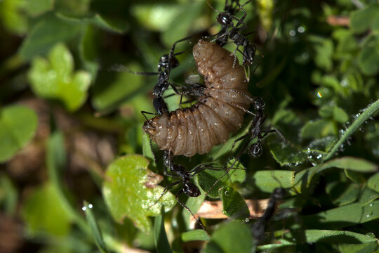 Ants capture a caterpillar alive in the Sierra de Grazalema Natural Park, Cadiz province, Andalusia, Spain