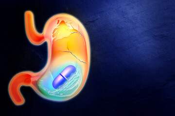 Heartburn treatment. Illustration of unhealthy stomach with antacid pill on dark blue background, space for text. Water symbolizing result of treatment