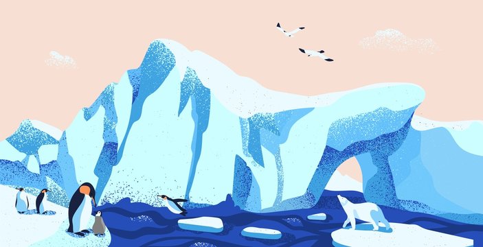 North pole, arctic ice landscape flat vector illustration. Beautiful antarctic scenery with local fauna. Glacier panorama with emperor penguins, polar bear and seagulls. Boreal climate inhabitants.