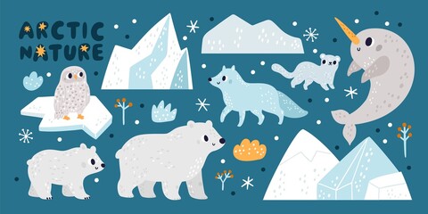 Cute arctic nature. Northern animal characters. Icebergs and ice floes. White bears with cub and fox. Cold climate inhabitants. Owl and ocean narwhal. Vector funny polar wild fauna set