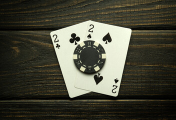Poker game with one pair combination. Chips and cards on the black vintage table in poker club. Free advertising space