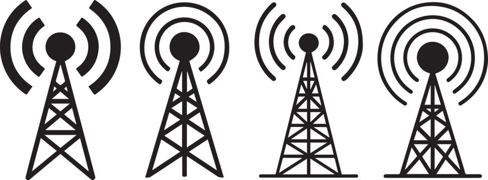 "Black and white communication tower icons with wireless signal waves, vector illustration of radio antenna transmitting data, mobile network broadcast and telecommunication design"