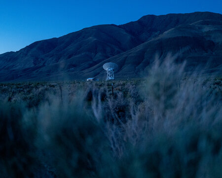 Blue hour at Owen's Valley radio observatory telescope under twilight dark sky