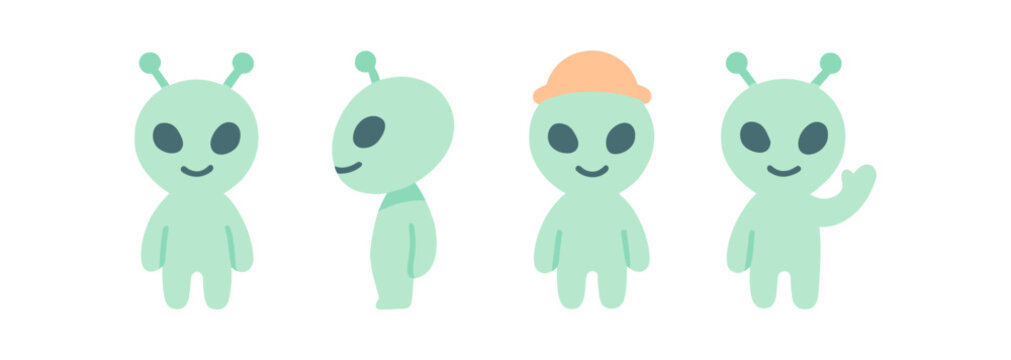 Cute cartoon alien characters with antennae and hats in different poses