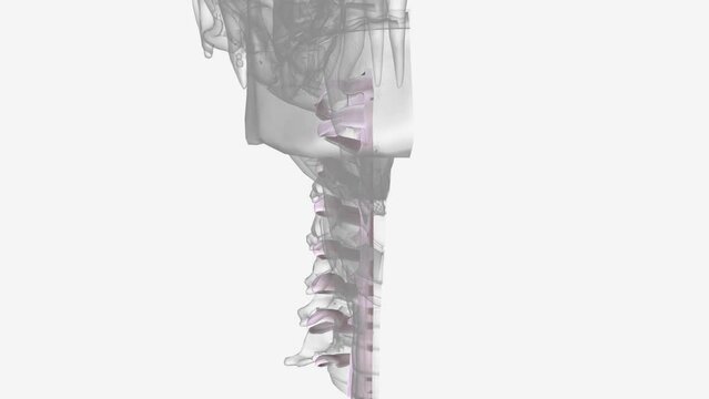 Detailed illustration of human neck anatomy showing cervical vertebrae, atlas and axis, vertebral discs, muscles, and blood vessels in precise anatomical accuracy.