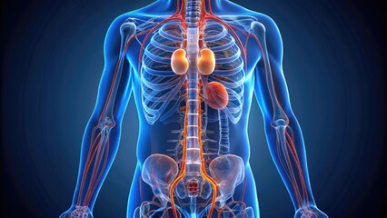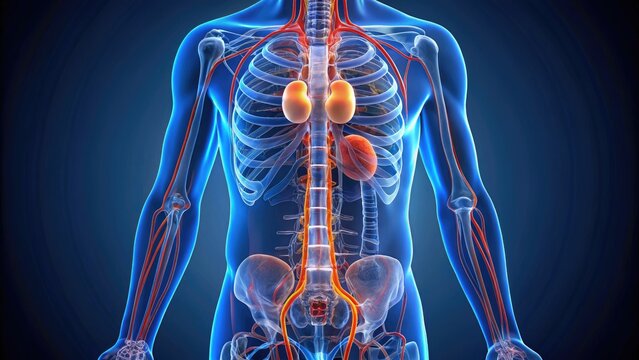 Illustrated 3D model of the human urinary system highlighting the kidneys, ureters, and bladder, showcasing their anatomical structure and relationship.