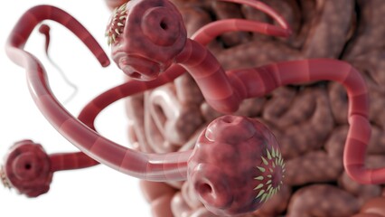 A 3d illustration of the Taenia tapeworm infection within the small intestine.