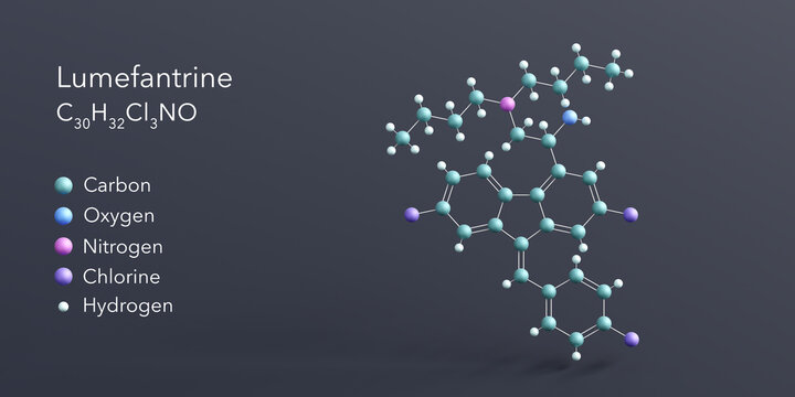 lumefantrine molecule 3d rendering, flat molecular structure with chemical formula and atoms color coding