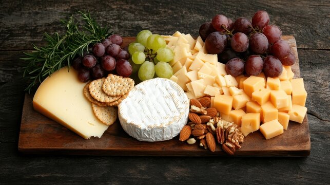 A rustic cheese board featuring a selection of cheeses, nuts, grapes, and fresh rosemary, artistically arranged on a dark wooden surface for a cozy ambiance.