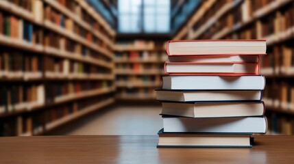 A Stack of Books Resting on a Wooden Table in a Library or Bookstore