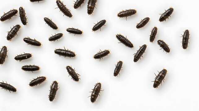 Carpet beetles larvae feeding on human hairs and skin flakes on white background