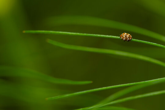 Tiny anthrenus scrophulariae on a green plant in nature setting