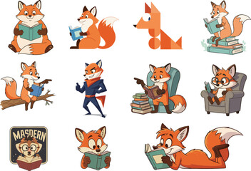 Charming fox reading book illustrations in various poses and activities, cute anthropomorphic animal characters for education, literature, and storytelling concepts