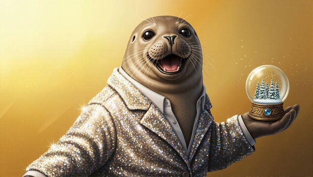 A happy smiling seal wearing a sparkly sequin jacket. The funny anthropomorphic animal character holds a winter snow globe. Whimsical holiday and celebration concept on a golden background