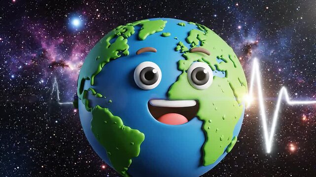 A vibrant 3D animated cartoon Earth character with a cheerful smiling face set against a breathtaking starry cosmic background symbolizing global connection environmental wellbeing and the dynamic pu.