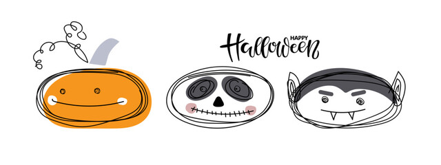 Smiling Halloween characters. Happy Halloween handwritten calligraphy card. Halloween pumpkin, skeleton, vampire, anthropomorphic faces. Hand drawn sketch in doodle outline style. Funny vector print.