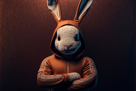 Portrait of a rabbit in a tracksuit, anthropomorphic animal illustration, AI-generated art