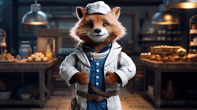 An anthropomorphic fox in a chef's hat and coat stands in a restaurant kitchen.