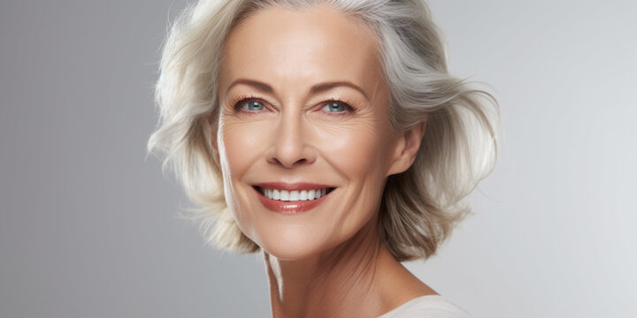 Portrait of Beautiful Older 50s 60s 70s Mid Aged Healthy Mature Woman Isolated on White Background. Anti-aging Skin Care Beauty, Cosmetics Concept. Natural Beauty Product.