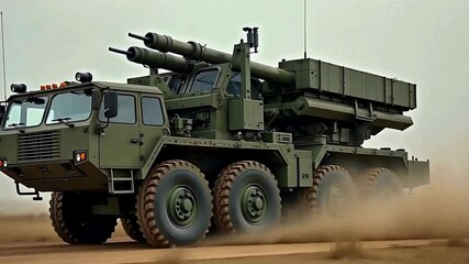 Russian military truck equipped with large anti-aircraft rocket launchers in a snowy forest landscape
