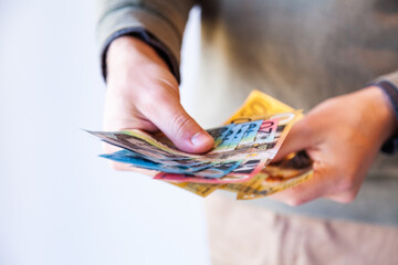 close up woman holding lot of 50 1000 new aud australian dollar. Financial concept