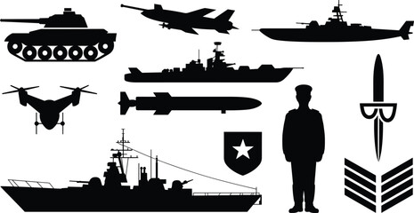 Military vehicles and weapons silhouette set, featuring tank, fighter jet, warship, missile, soldier, and naval aviation icons for defense security design projects