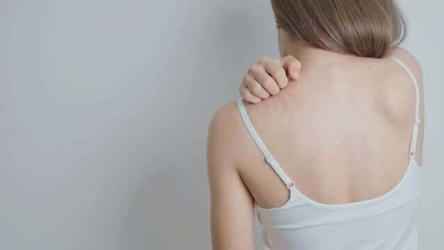 woman itching and scratching itchy back. Sensitive Skin Allergic reaction to insect bite, food, drug dermatitis. Dermatology, Leprosy, Systemic lupus erythematosus, Allergy symptoms and rash Eczema