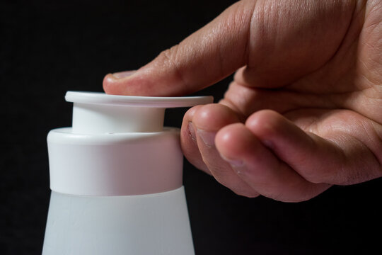 Female fingers pumping alcohol-based hand sanitizer gel on hand for killing germs, bacteria and virus. Disinfection concept of cleaning and washing hands with alcohol sanitizer.