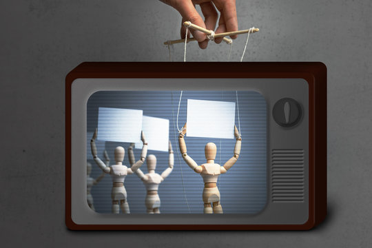 Fake News on TV. Provocateur puppet activist is calling people to protest. Hand-held puppet doll on the ropes and crowd of people with posters for rally.