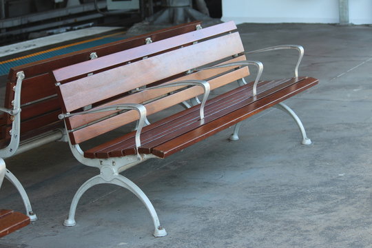 Example of hostile design or aggressive industrial design. A timber and metal bench seat at a train station with four arm rests. The design prevents the homeless from laying down.