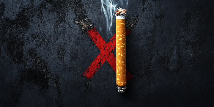 Burning cigarette with red X on dark background, symbolizing anti-smoking campaign, health awareness, and dangers of tobacco