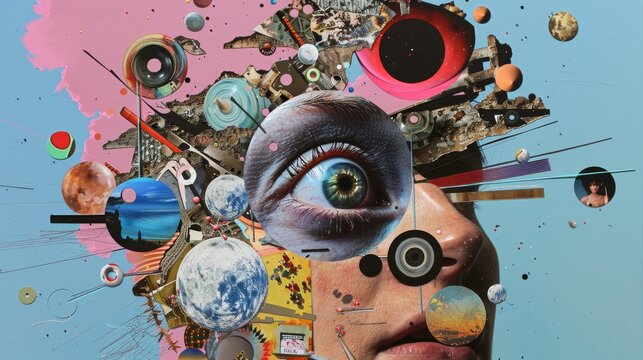 Surreal Collage Art with Eye Centerpiece and Cosmic Elements