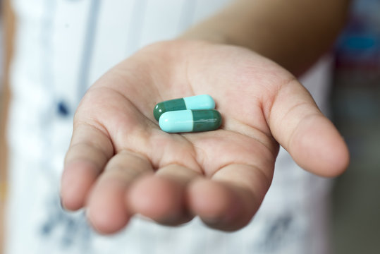 capsules of medicine for anti biotic, blue and green capsules in my hand.