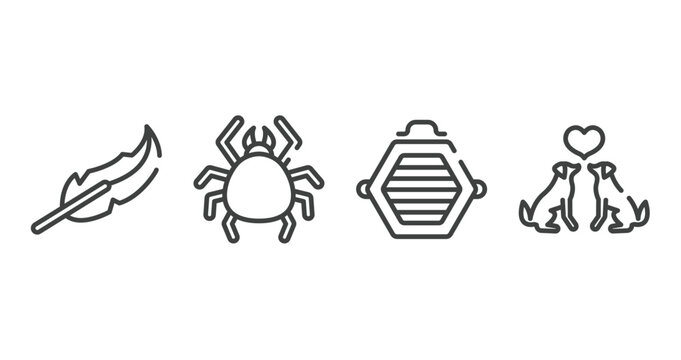 dog and training outline icons set. thin line icons sheet included feathers, big mite, cat box, couple of dogs vector.