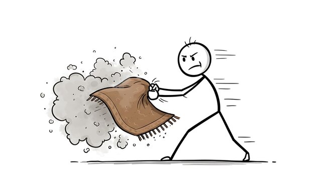 Animated stick figure vigorously cleaning a dusty rug, dust cloud surrounding