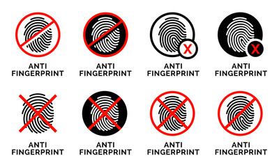 Anti fingerprint signs. Flat, fingerprint icon, red prohibition line, anti fingerprint icons. Vector icons
