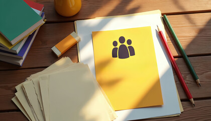 Company policy document with group icon sits on a desk with books and writing tools. Papers stacked ready for review and approval. Workplace safety and HR guidelines.