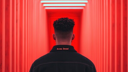 anti tracking and security. A person stands in a narrow corridor illuminated by vibrant red light, facing away, creating a striking visual effect.