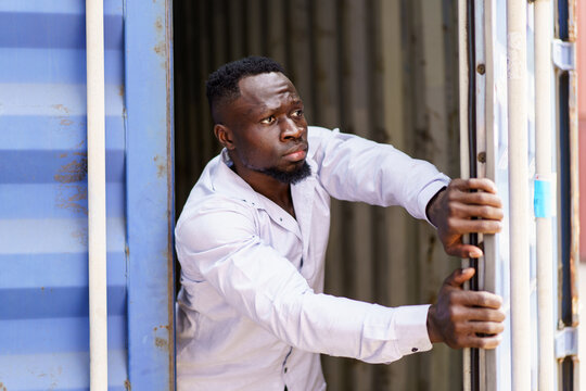 Anti human trafficking concept. A man is escaping out the cage or container.