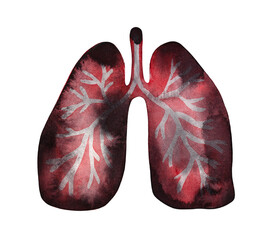 Water color stylized drawing of dark damaged unhealthy human lungs. One single object, front view. Handdrawn watercolour graphic painting, cutout clip art element for design, banner, sign, emblem.