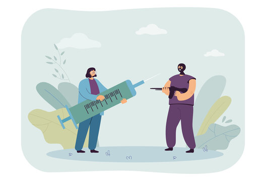 Terrorist threatening nurse holding giant syringe with gun. Anti-vaccination movement flat vector illustration. Vaccination, violence concept for banner, website design or landing web page