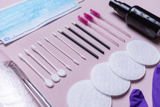 Anti virus hygienic makeup covid with disposable material, alcohol and mask. Pink background. Top view